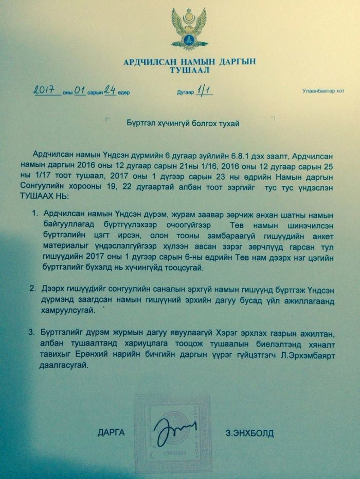 Дээрх гишүүдийг сонгуулийн саналын эрхгүй намын гишүүнд бүртгэх гэнэ. Бүртгэлийг дүрэм, журмын дагуу явуулаагүй Хэрэг эрхлэх газрын ажилтан, албан тушаалтанд хариуцлага тооцохыг Ерөнхий нарийн бичгийн даргын үүрэг гүйцэтгэгч Л.Эрхэмбаярт даалгажээ.