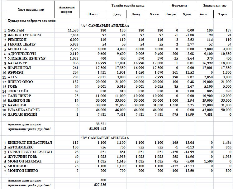 Өнөөдрийн арилжаагаар нийт 26 ХК-ийн 38.8 мянган ширхэг хувьцааг 51.5 сая төгрөгөөр арилжлаа.