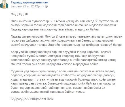 Харин удалгүй Гадаад харилцааны яамнаас мэдэгдэл гаргаж олон нийтийн мэдээллийн хэрэгслээр БНХАУ-ын иргэд Монгол Улсад 30 хүртэлх хоногоор визгүй зорчино гэсэн мэдээлэл ор үндэслэлгүй хэмээн мэдэгдэл хийж байлаа.