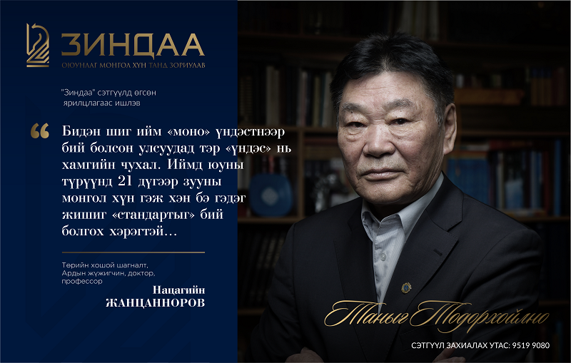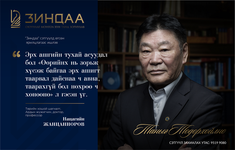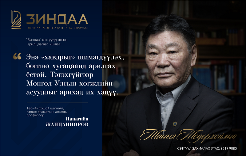 Төрийн хошой шагналт, Ардын жүжигчин, доктор, профессор Н.Жанцанноровын дотоод ертөнцөд аялахыг хүсвэл “Зиндаа” сэтгүүлийг авч уншаарай. Та 98109080 утсаар залган сэтгүүлээ захиалж үнэгүй хүргүүлэх боломжтой. Уншигчдадаа сэтгүүл зүйн чанартай бүтээл хүргэхийн төлөө хичээн ажилласан бидний хичээл зүтгэл таны сэтгэлд нийцнэ хэмээн найдаж байна.