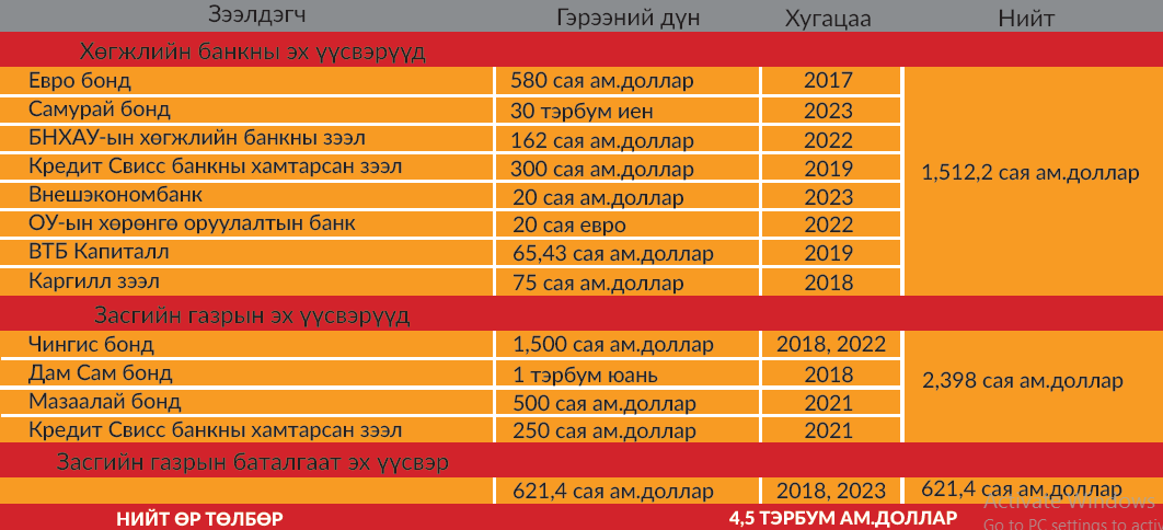 Монгол Улсын гадаад өрийн хэмжээ өнөөдөр аюулын харанга дэлдээд буй юм. Үүнийг баталсан нэгэн ноцтой мэдээлэл олдоод байна. Монгол Улс нийт 23.4 тэрбум ам.долларын зээлийн өртэй. Энэ өрийн ихэнхийг өнгөрсөн Шинэчлэлийн Засгийн газрын үед тавьсан байдаг. Н.Алтанхуягийн Засгийн газрын үед Эдийн засгийн хөгжлийн сайдаар ажиллаж байсан Н.Батбаяр нарын Хөгжлийн банкны эх үүсвэрээр авсан их хэмжээний зээл хугацаанаасаа өмнө дуудагдах эрсдэлд хүрчээ.