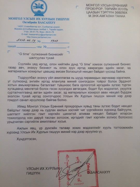 Тэрээр "Сүүлийн үед иргэд, олон нийтийн дунд “G time” хэмээх сүлжээний бизнес газар авч, энэхүү бизнест нь олон зуун иргэд хамрагдан эдийн засаг, эд материалын хохирлыг цаашид амсаж болзошгүй нөхцөл байдал үүсээд байна. Тодруулбал энэхүү үйл ажиллагаа нь шууд пирамидын зарчмаар хэрэгжиж, уг сүлжээнд энгийн иргэд ялангуяа Эрдэнэт хотын амьжиргааны баталгаат түвшнээс бага орлоготой иргэдийн зүгээс түргэн хугацаанд мөнгөтэй болох гэсэн хүсэлдээ автагдаж, бодит бус мэдээлэл, ухуулга сурталчилгаанд автан эдийн засаг, эд материалын хохирол авах нөхцөл бүрдэж эхэлсэн тухай иргэдээс гомдол санал маш их ирж байна. Энэ нөхцөл байдлаас үүдэн УИХ-ын гишүүн О.Баасанхүү энэхүү сүлжээний бизнест хяналт шалгалт хийлгүүлэхээр Монгол Улсын Ерөнхий прокурорт албан шаардлага хүргүүллээ" гэжээ.