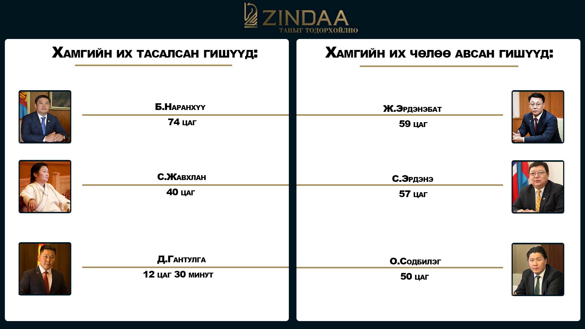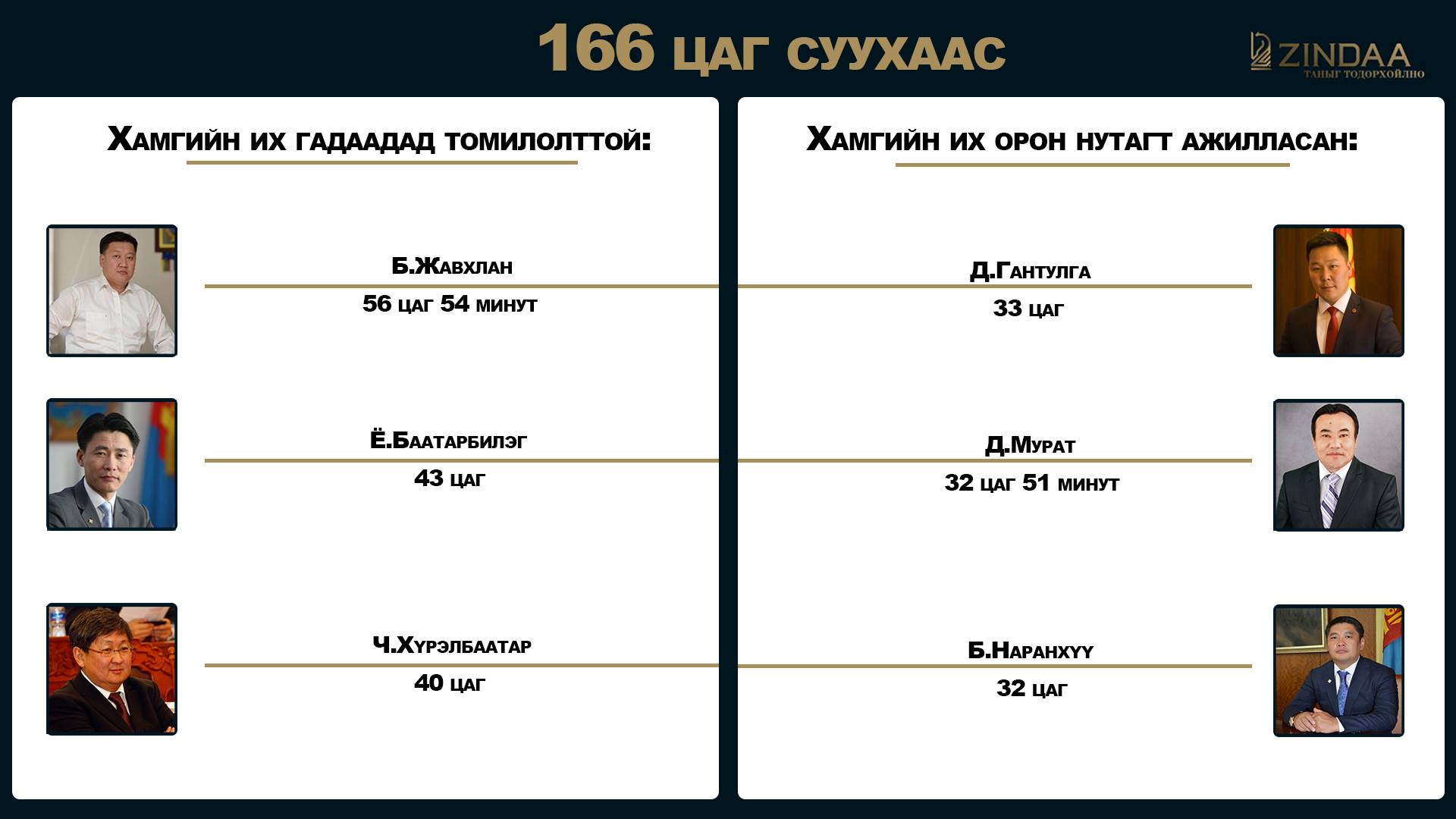 Чуулганд гишүүд нийтдээ 166 цаг суух байснаас өнгөрсөн жилийн муу сурагч Б.Наранхүү энэ жил ч мөн зангаа тавьсангүй 140 цаг суугаагүй гэсэн үзүүлэлтээр жагсаалтыг тэргүүлжээ. Тэгвэл 29 настай хамгийн залуу гишүүн маань балчирдаад байна уу? Ичээд байна уу? Б.Наранхүү ахынхаа араас 108 цаг хичээлээ тасдсан үзүүлэлтээр удаалж байна. Харин хичээлээ тасалдаггүй сайн сурагчдын жагсаалтыг хаширууд болох Д.Тэрбишдагва, Ц.Нямдорж нар тэргүүлжээ.