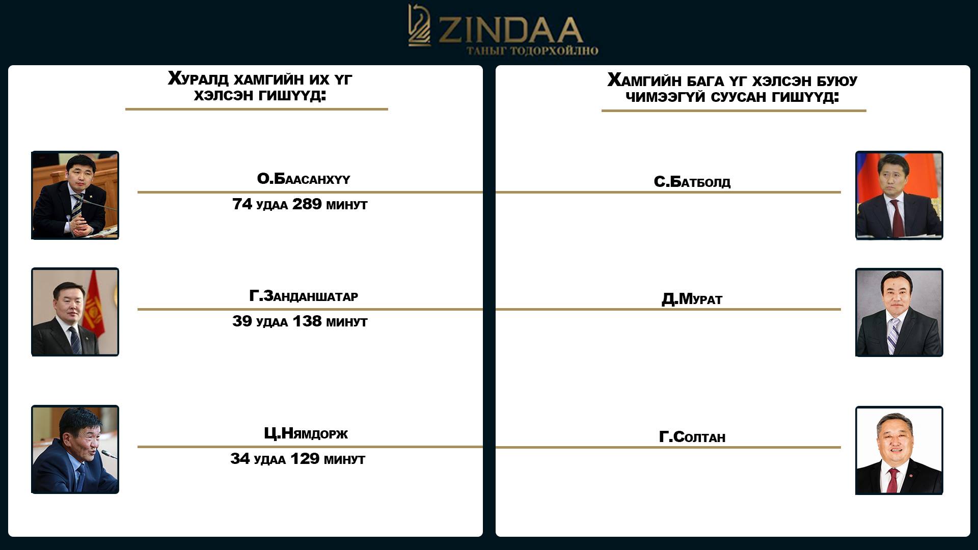 Харин хамгийн их хэл амтай гишүүнээр О.Баасанхүү гишүүн тодорчээ. Тэрээр 74 удаа товчлуур дарж 289 минут ярьсан байна. Тэгвэл ус залгисан юм шиг юу ч ярьдаггүй гишүүнээр “Нүүрсчдийн нам”-ын толгойлогч С.Батболд тодорчээ.
