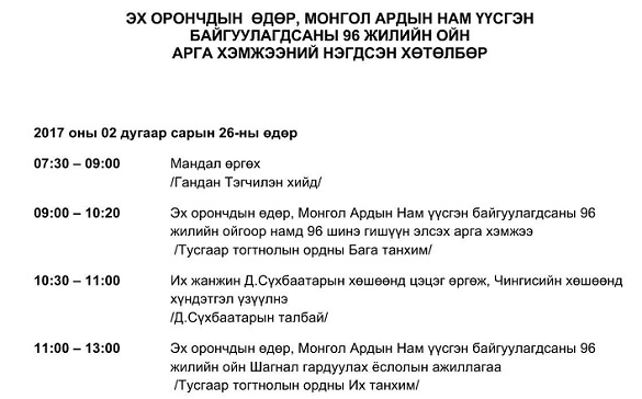 "Эх орончдын өдрийн хүрээнд МАН-д шинэ гишүүн элсүүлэх үйл ажиллагаа Тусгаар тогтнолын ордонд болох бол 10.30 цагт Их жанжин Д.Сүхбаатарын хөшөөнд цэцэг өргөж, Чингисийн хөшөөнд хүндэтгэл үзүүлэх ёслол болох юм байна. Түүнчлэн 11 цагаас Тусгаар тогтнолын ордонд баярын арга хэмжээ зохион байгуулагдах ажээ.