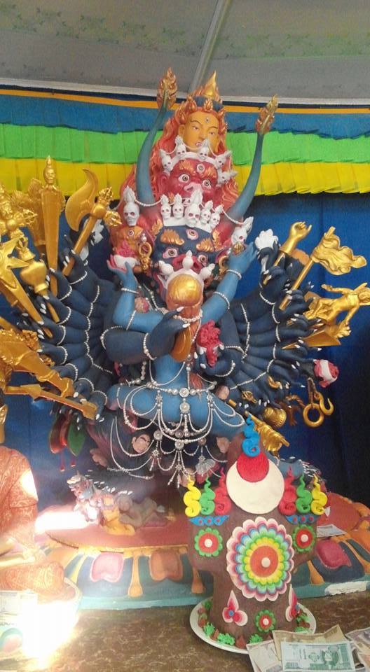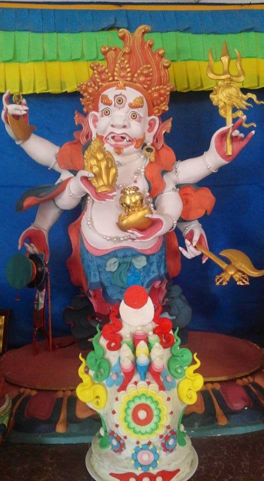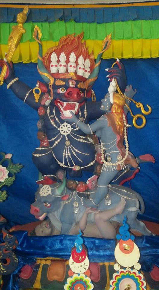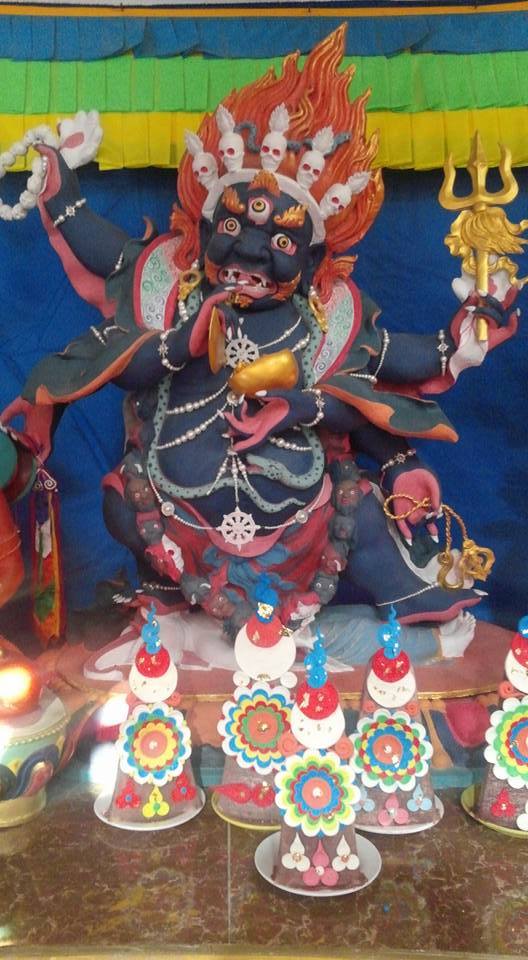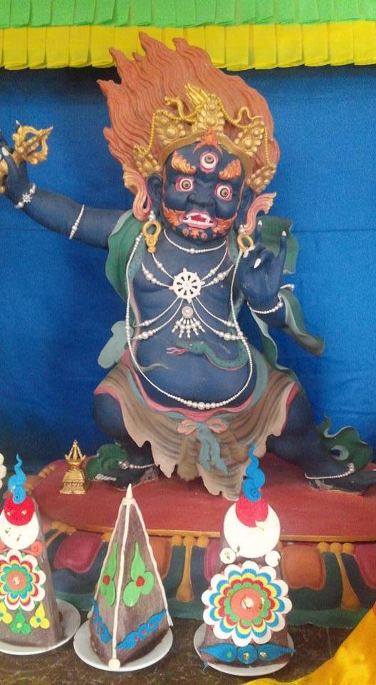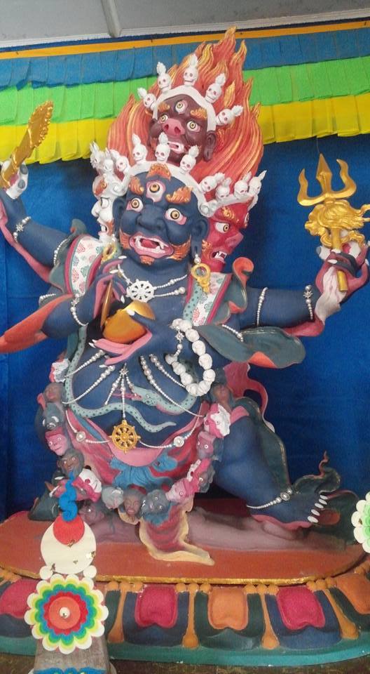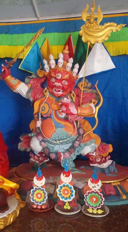 Хөмсөг сахлаас нь гал бадарсан, хурц соёотой, хэл нь мушгирсан, луугийн дуугаар дуугарсан, цусан дусал бүхий нүгэлтний толгойгоор эрхи хийн лагшиндаа өлгөсөн, хар могой болон хүний ясаар чих, бугуй, шилбээ чимсэн, бадамлянхуа цэцэгт наран дэвсгэр дээр өөрийн дагина /юүм/ Доржсолонма хэмээх цэнхэр өнгөт /баруун мутартаа гавал барьсан/ нүцгэн эмийг барьж зогсоно.