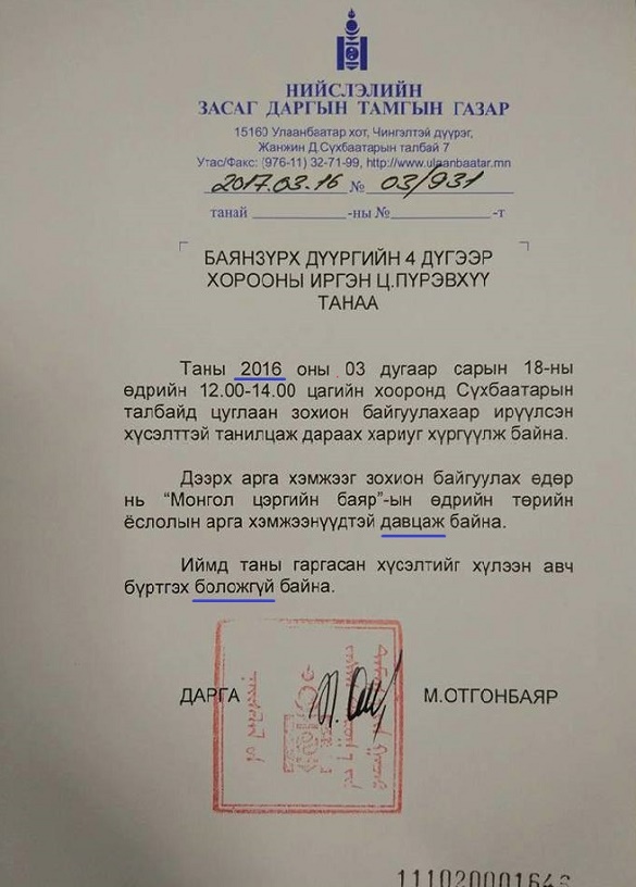 “Утааны эсрэг ээж аавууд” төрийн бус байгууллагынхан ээлжит жагсаалаа гуравдугаар сарын 18-ны бямба гаригт зохион байгуулахаар төлөвлөж, Нийслэлийн Засаг даргын Тамгын газарт ханджээ. Уг хүсэлтэд Нийслэлийн Засаг даргын Тамгын газрын дарга М.Отгонбаяр боломжгүй гэдэг хариу өгсөн албан тоотод олон алдаа гаргасан нь шүүмжлэхэд хүргэж буй юм.