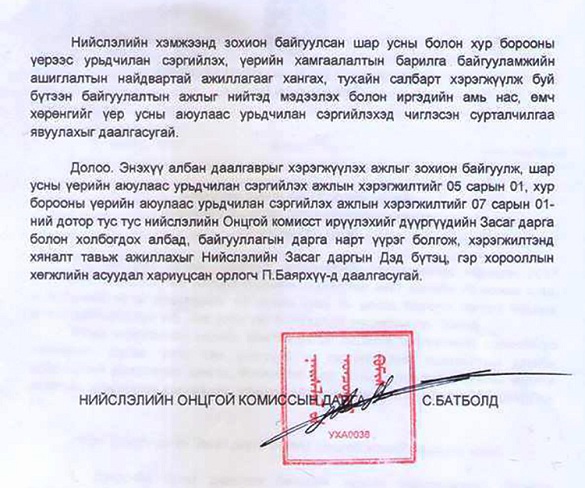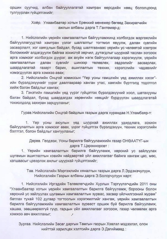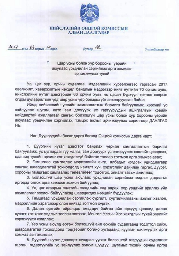 Нийслэлийн Онцгой комиссын дарга, Улаанбаатар хотын Захирагч С.Батболд шар усны болон хур борооны үерийн аюулаас урьдчилан сэргийлэх арга хэмжээг эрчимжүүлэх тухай албан даалгавар гаргалаа. Ус цаг уур, орчны судалгаа, мэдээллийн хүрээлэнгээс гаргасан өвөлжилт, хаваржилтын нөхцөл байдлын мэдээгээр нийт нутгийн 70 орчим, нийслэлийн нутаг дэвсгэрийн 60 орчим хувьд нь цасан бүрхүүл тогтож хаврын огцом дулааралтын үед шар усны үер болж болзошгүйг анхааруулсан байна.