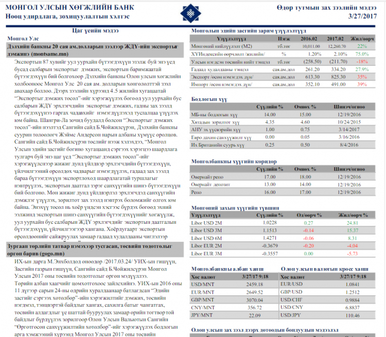 Хөгжлийн банк: Өдөр тутмын зах зээлийн мэдээ