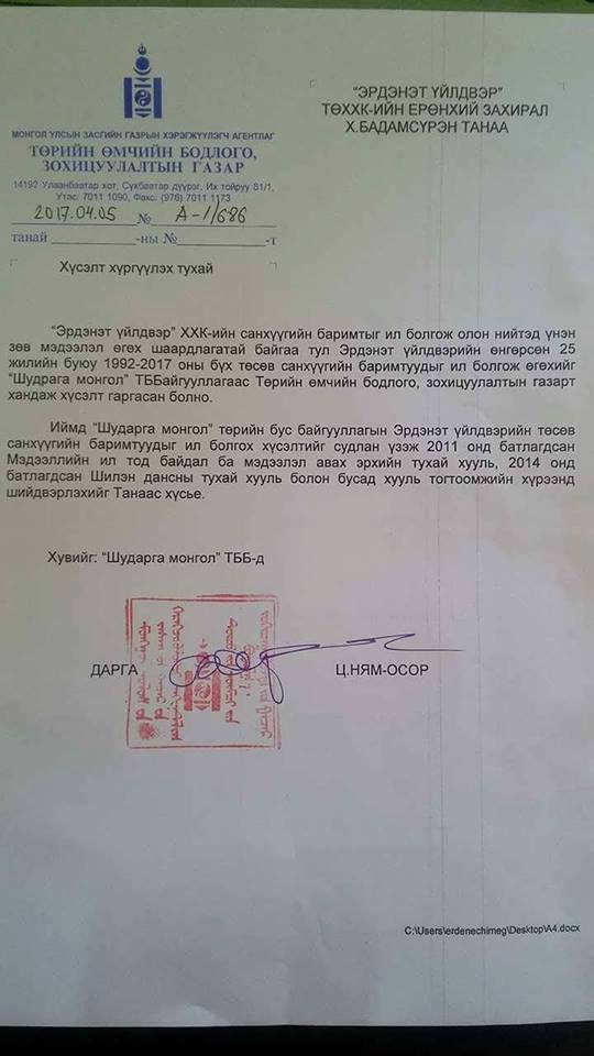 Өнөөдөр төрийн ордны баруун талд Шударга Монгол ТББ, Олон нийтийн 11-11 төвийнхөн тайван жагсаал хийлээ. Тэд Эрдэнэт үйлдвэрийн 51 хувийг шалгах, санхүүгийн баримтыг нээлттэй мэдээлэх шаардлага тавьсан. Энэхүү үйл ажиллагааг дэмжиж гарын үсгээ зурсан иргэдийн тоо өдрөөс өдөрт нэмэгдэж байгаа аж. Тэд УИХ-ын дарга М.Энхболдод шаардах бичиг хүргүүлж, хариуг долоо хоногийн дотор авахаа мэдэгдсэн. Хэрэв өмнөх шиг тодорхой хариу өгөхгүй бол тэмцлийн хурц хэлбэрт шилжинэ гэдгээ илэрхийлж байлаа. Өнгөрсөн хугацаанд Олон нийтийн 11-11 төвд иргэдээс ирсэн саналын дийлэнх хувийг Эрдэнэт үйлдвэрт нүүрлэсэн шударга бус болгоныг ил болгож, таслан зогсоохыг хүссэн хүсэлт эзэлж байжээ. Тиймээс тус төвийн үүсгэн байгуулагч М.Хүдэрбаатар төрийн гурван өндөрлөгт “51 хувийг шалгуулъя, 49 хувийг иргэддээ хувьчилъя” гэдэг санал албан бичгээр өгөөд байсан билээ. Мөн Шударга Монгол ТББ-ын тэргүүн Г.Цэрэнтогтох Эрдэнэт үйлдвэрт үе үеийн дарга нарын хийсэн шахааг ил болгох, 1992-2017 оны санхүүгийн баримтыг олон нийтэд нээлттэй зарлах шаардлагыг ТӨБЗГ-т өгсөн. Уг шаардлагын дагуу Ц.Ням-Осор дарга Эрдэнэт үйлдвэрийн захирал Х.Бадамсүрэнд албан бичиг хүргүүлсэн аж. Уг тоотод “2011 онд батлагдсан Мэдээллийн ил тод байдал ба мэдээлэл авах эрхийн тухай хууль, 2014 онд батлагдсан Шилэн дансны тухай хууль болон бусад хууль тогтоомжийн хүрээнд шийдвэрлэхийг хүсье” гэсэн байдаг. Одоогоор Эрдэнэт үйлдвэрийн зүгээс ямар ч хариу өгөөгүй, харин ч хууль бус үйлдлээ улам дэвэргэж, ард түмнээ “нохой хуцсан чинээ” тоохгүй байгааг тэмцэгчид онцолж байлаа. Тэд Орхон аймагт очиж шаардлагаа хүргүүлэх гэсэн боловч хамгаалалтын албаныханд хөөгдөж гарсан тухайгаа ч ярьж байна.