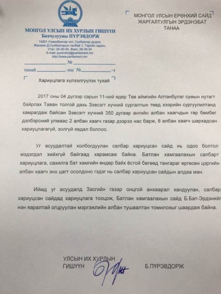 Энэхүү хэрэгт холбогдуулан УИХ-ын гишүүн Б.Пүрэвдорж Батлан хамгаалахын сайд Б.Бат-Эрдэнэд хариуцлага хүлээлгэж, огцруулах саналаа Ерөнхий сайд Ж.Эрдэнэбатад өнөөдөр хүргүүллээ.