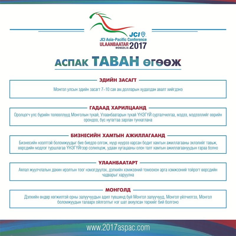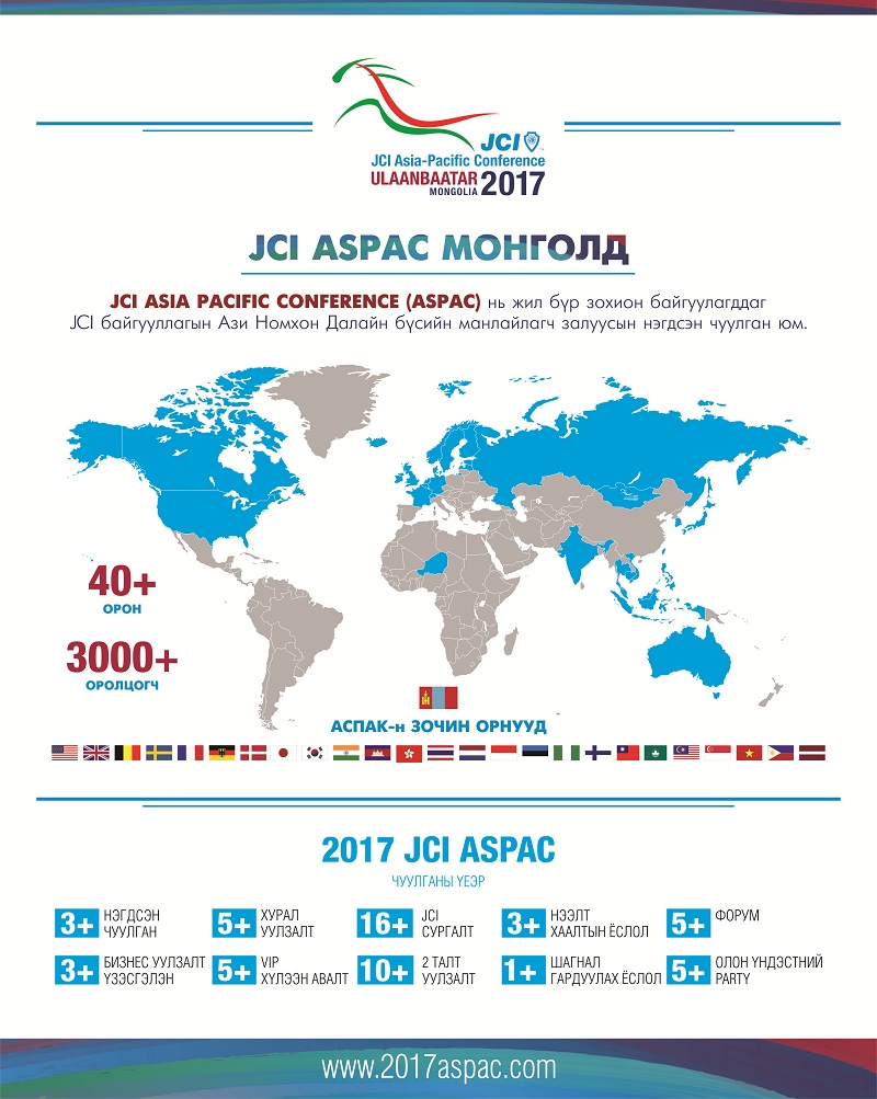 Энэ оны 6 сарын 8-11 хооронд JCI байгууллагын Ази, номхон далайн бүсийн чуулга уулзалт (АСПАК) Монгол улсад Улаанбаатар хотноо зохион байгуулагдах гэж байна.