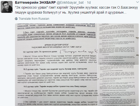 Харин түүнийг мэдээлэл хийсний дараагаар ХЗДХ-ийн дэд сайд Б.Энхбаяр өөрийн твиттэр хуудаснаа “Эх орноосоо урвах" гэмт хэргийг Эрүүгийн хуулиас хассан гэж О.Баасанхүү гишүүн цуурахаа больчуул уг нь. Хуулиа уншилгүй арай л цуурахын. Одоо яамаар ч юм бэ дээ! Ийм зүйл ангийг Эрүүгийн хуулийн төслөөс авч хаясан бол бурхан намайг гэсгээг. Бичиг үсэгт тайлагдсан л баймаар юм!” хэмээн жиргэжээ.