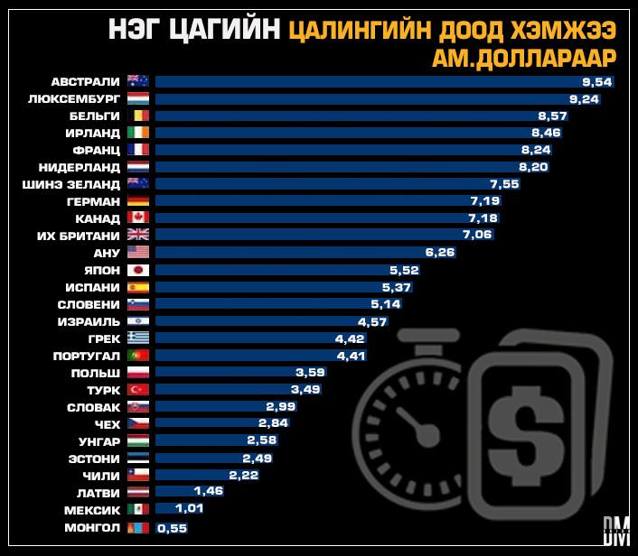 Дэлхийн улс орнуудын цалингийн хэмжээ эдийн засгийн хөгжлөөсөө хамаараад харилцан адилгүй байдаг. Тэгвэл улс орны нэг цагийн хөлсөөр нь жагсаахад Монгол Улс хамгийн доод үзүүлэлттэйгээр сүүлийн байранд оржээ.