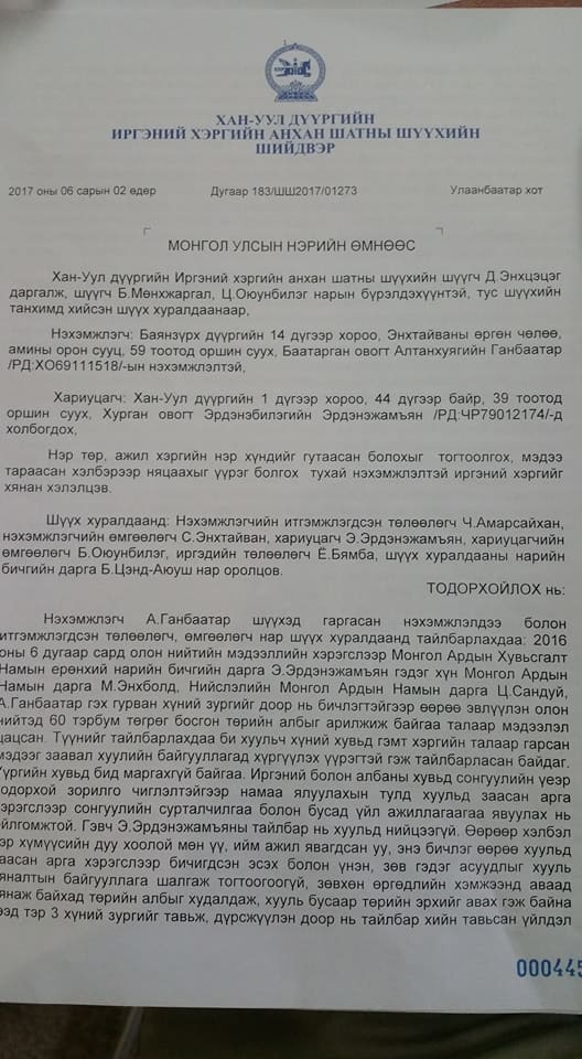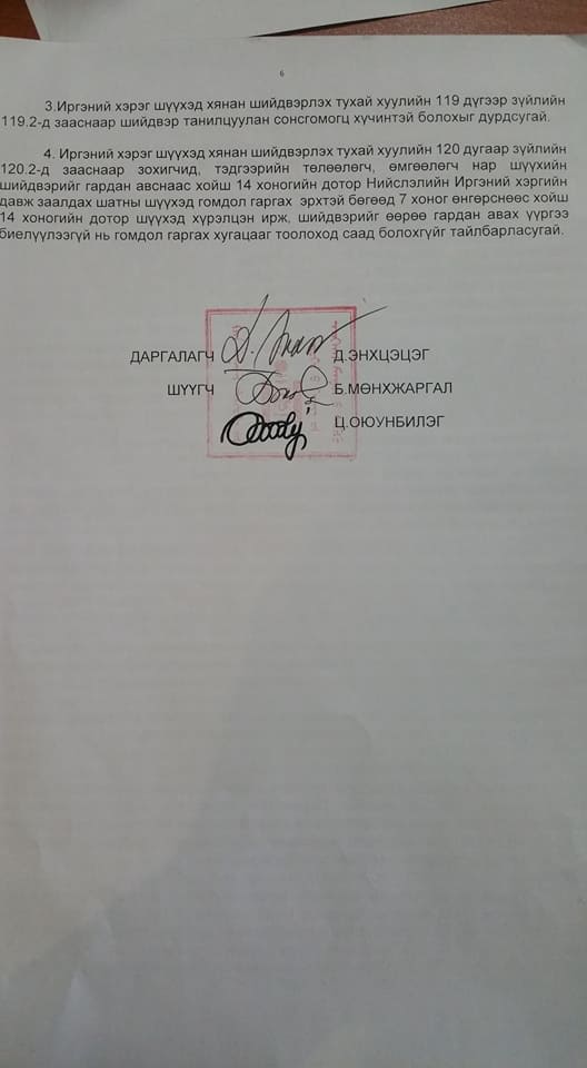 Дээрх маргааныг Хан-Уул дүүргийн Иргэний хэргийн анхан шатны шүүхээр хэлэлцэж Э.Эрдэнэжамьяанг бусдын нэр төрд халдсан хэмээн буруутайд тооцсон. Шүүхээр батлагдаж нотлогдоогүй мэдээллийг олон нийтэд цацсан, улс төрийн зорилгоор бусдын нэр хүндэд халдсан гэж үзсэн байна. Иймд дээрх мэдээлэлд няцаалт хийж хэвлэл мэдээллийн хэрэгслээр залруулга гаргах үүргийг Э.Эрдэнэжамьяанд шүүхээс даалгасан байна. Энэ сарын 2-ны шийдвэрийг бичгээр Э.Эрдэнэжамьяанд өнөөдөр шүүхээс ирүүлжээ.