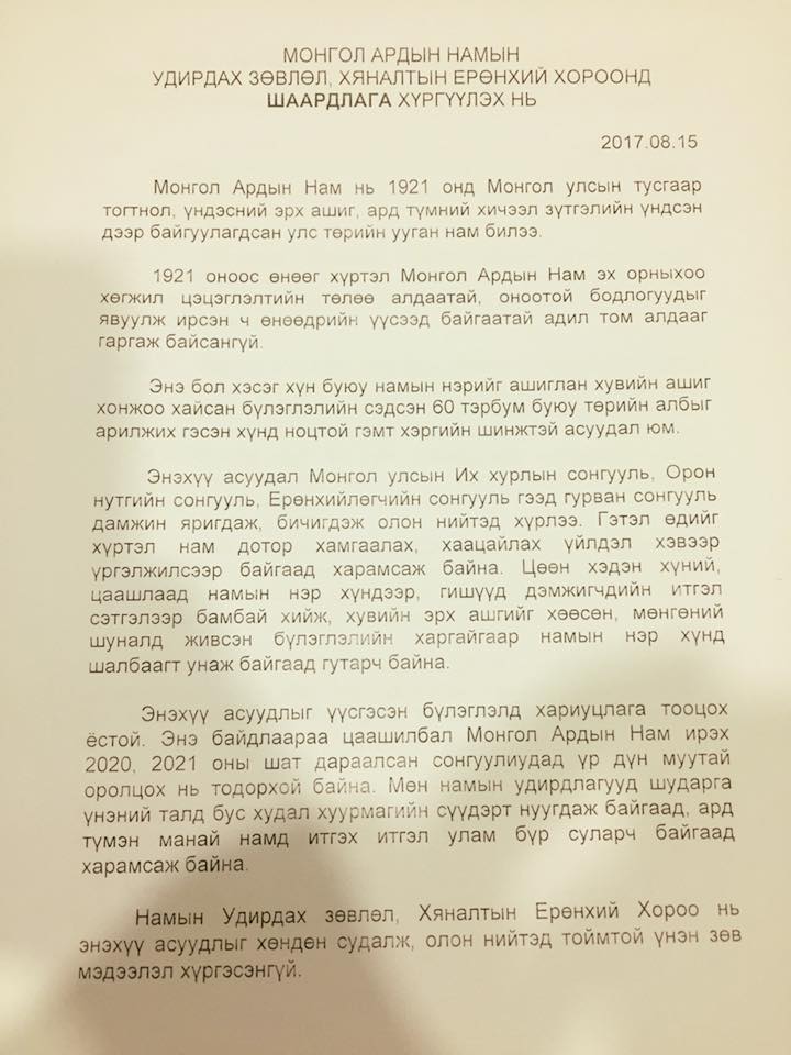 Шаардлагын хариуг наймдугаар сарын  25-ны дотор өгөхгүй бол намын гишүүд дэмжигчдийг уриалан улс төрийн томоохон тэмцэл хийхээ мэдэгдэв. Сонирхуулахад, Б.Бат-Эрдэнэ нь НАМЗХ-ны Ерөнхий нарийн бичгийн даргаар ажиллаж байсан юм.