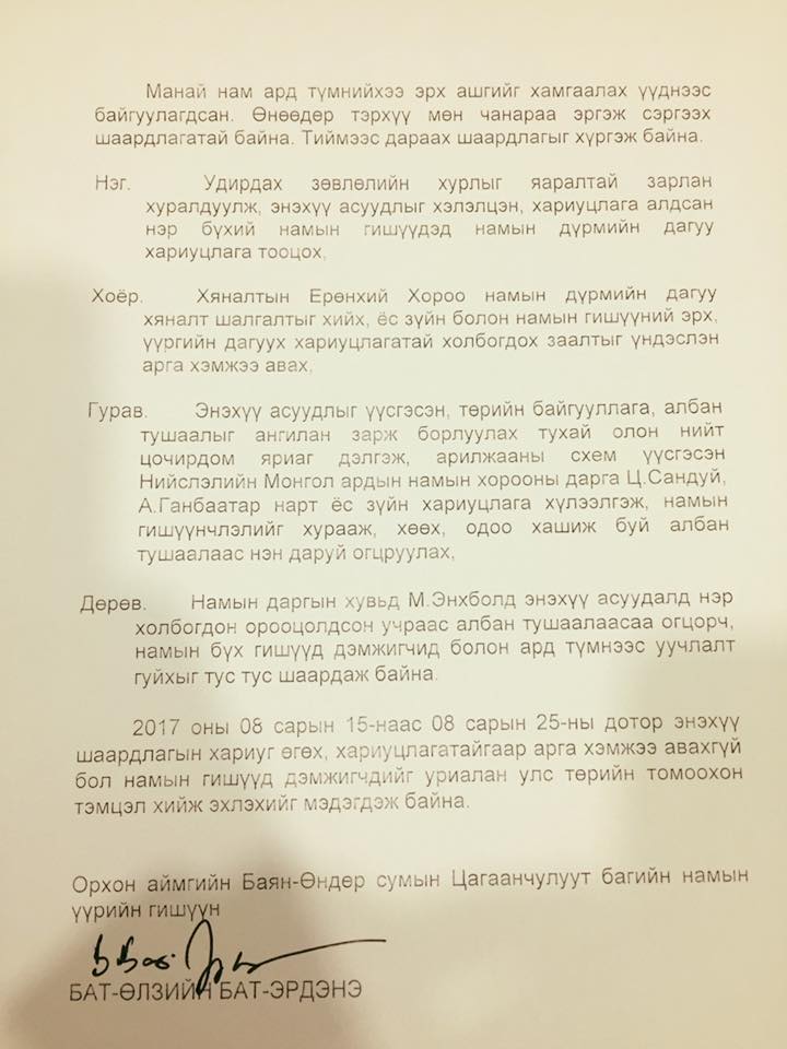 Орхон аймгийн Баян-Өндөр сумын Цагаан чулуут багийн  МАН-ын үүрийн гишүүн Б.Бат-Эрдэнэ  намынхаа  Хяналтын Ерөнхий Хорооны дарга Х.Болдмандал,  МАН-ын улстөр, намын байгуулалтын газрын дарга Б.Баярбаатар нарт шаардах бичиг хүргүүлжээ.  Тэрээр  энэ талаар "Намын нэр хүндийг өөрсдийн эрх ашгийн төлөө зольж яваа нөхдүүдэд хариуцлага тооцож ажиллахыг Хяналтын Ерөнхий Хороо, Удирдах зөвлөлөөс шаардана.Төрийн албыг арилжих тухай яриа гаргасан, нэр хүнд холбогдсон гишүүддээ Удирдах зөвлөл, Хяналтын Ерөнхий Хороо намын дүрмийн дагуу хариуцлага тооцох хэрэгтэй хэмээн үзэж ийн шаардах бичиг хүргүүж байна.  Төрийн албыг наймаалцсан тухай асуудлыг үүсгэсэн бүлэглэлд хариуцлага заавал тооцох ёстой. Хэрэв энэ байдлаараа цаашилбал манай нам ирэх 2020, 2021 оны шат дараалсан сонгуулиудад муу оролцох нь тодорхой байна.  Манай нам ард түмнийхээ эрх ашгийг хамгаалах үүднээс байгуулагдсан. Өнөөдөр гэтэл энэхүү мөн чанараа эргэн сэргээх шаардлагатай байна" гэлээ.