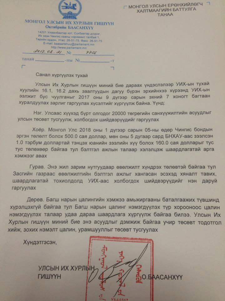 УИХ-ын гишүүн О.Баасанхүү өнөөдөр Монгол Улсын ерөнхийлөгч Х.Баттулгад хандан “УИХ-ын ээлжит бус чуулганыг есдүгээр сарын эхний 7 хоногт багтаан зарлан хуралдуулах” зарлиг гаргуулах хүсэлтийг хүргүүллээ.