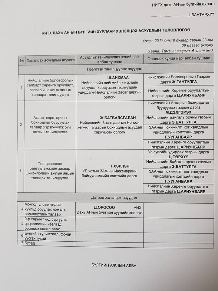 Түүнчлэн УИХ дахь АН-ын бүлгийн даргын зөвлөх Д.Оросоо Үндсэн хуулийн өөрчлөлтийн талаарх хэлэлцүүлэг, тайлан мэдээллийг бүлгийн хуралд танилцуулж мэдээлэл аж. Нийслэлийн АН-ын бүлгийн хуралдаанаар НИТХ-ын дарга Ц.Сандуйг огцруулах асуудлыг хэлэлцэх мэдээлэл байна.