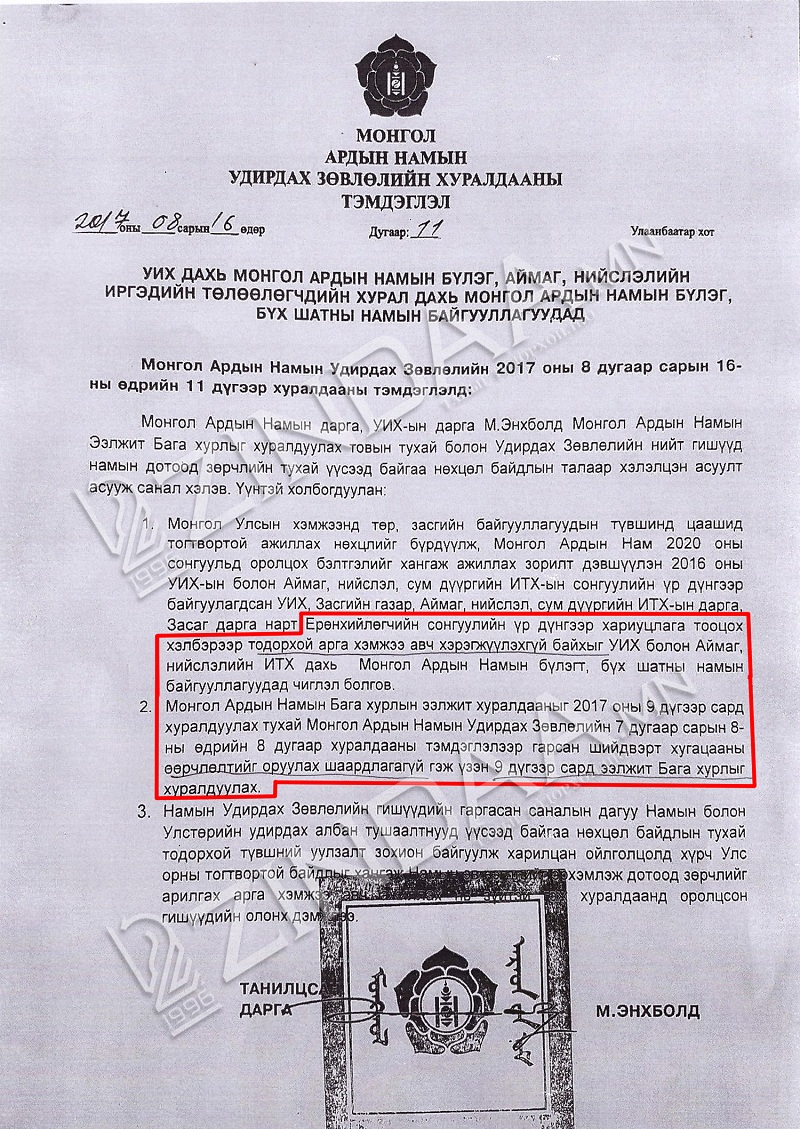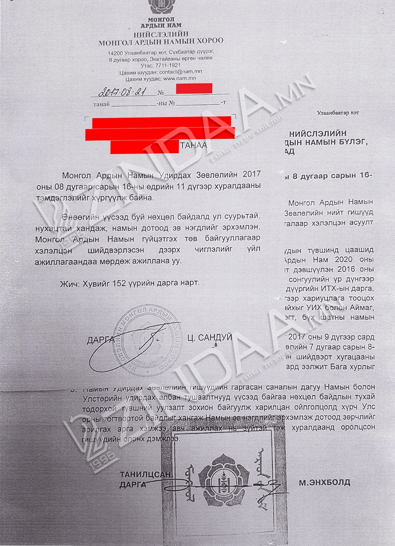 Энэхүү шийдвэртэй холбогдуулан “60 тэрбумын автор” Ц.Сандуй 2017 оны 8 сарын 21-ний өдөр Нийслэлийн МАН-ын хорооны өмнөөс нэгэн албан бичгийг намын анхан шатны байгууллагын дарга нартаа зориулан илгээжээ. МАН-ын Удирдах Зөвлөлийн 11 дүгээр хуралдааны тэмдэглэлийг хавсаргасан уг албан бичигт “Өнөөгийн үүсээд байгаа нөхцөл байдалд ул суурьтай, нухацтай хандаж, намын дотоод эв нэгдлийг эрхэмлэн, МАН-ын гүйцэтгэх төв байгууллагаар хэлэлцэн шийдвэрлэсэн дээрх чиглэлийг үйл ажиллагаандаа мөрдөж ажиллана уу. Жич: Хувийг 152 үүрийн дарга нарт” гэжээ.