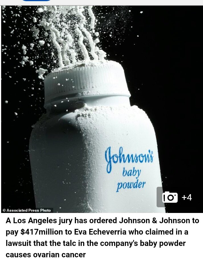 Johnson & Jonhson компанийг Echeverria гэх эмэгтэй шүүхэд өгчээ. Тэр эмэгтэй хавдартай болсон бөгөөд тус компанийн Baby powder бүтээгдэхүүнээс болж хавдартай болсон гэсэн байна. Улмаар шүүхийн шийдвэр эмэгтэйн талд гарчээ. Johnson & Jonhson компаниас эмэгтэйд 417 сая ам доллар төлөх шийдвэр гаргасан байна.