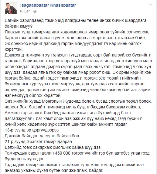 элбэгээгийн буянаар 5сая төг авч байж хоолоо бүү гол.бид бөхчүүдээс бага хөдөлмөрлөж бага цалин аваагүй.ягдаа миний хөдөлмөр тамирчны хөдөлмөр 2-ын аль нь монголыг хөгжүүлэх вэ. улсыг слорт урлаг,яруу найраг хөгжүүлж дэлхийд таниулагдагүй. японы олон аваргаар японыг дэлхий таниагүй сони тоёотогоор таньдаг. махачкала-д дэлхий олимпийн олон удаагийн аваргууд гудамжаараа усны тэргээ түрээд сүлжилдэж бгаа гэтэл мхачкалааг дэлхийд танихгүй. бид өнөөдөр э/з ямар бгаа билээ зам барих,тэц барихад мөнгөө зарахуу тамирчдаа тэжээхэд мөнгөө зарах уу.дэлхийн тамирчид улсдаа маш их мөнгө оруулдаг.манайх х