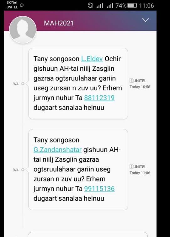 Засгийн газрыг огцруулах саналд гарын үсэг зурсан гишүүд болох Ж.Ганбаатар, Ж.Энхбаяр, Б.Батзориг, Г.Занданшатар, Л.Элдэв-Очир зэрэг гишүүдийн нэр хүндэд халдах зорилгоор үүрэн операторын сүлжээ ашиглан иргэд рүү санал асуулга явуулсан байна. Тухайлбал, "Таны сонгосон Ж.Ганбаатар гишүүн АН-тай нийлж Засгийн газраа огцрцуулахаар гарын үсэг зурсан нь зөв үү? гэсэн мессежийг илгээжээ.