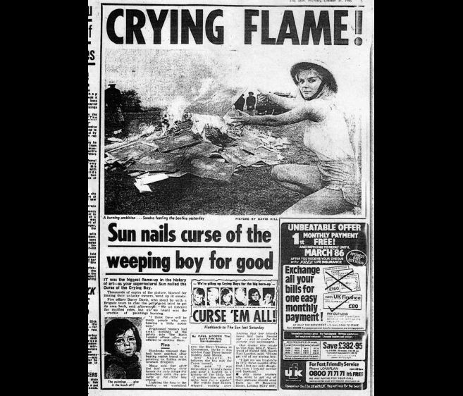 Тайлагдашгүй нууцаараа алдартай Англид энгийн нэг уран зургийн хуулбар гай дагуулдаг итгэмээргүй үзэгдэл гарчээ. 1985 оны 9-р сард эл явдал мэдээллийн хэрэгслээр цацагдаж олны анхаарлыг татжээ. York хошууны гал сөнөөгчид дуудлага авмагцаа түймэр гарч байгаа газар ирсэн боловч түймэр дийлдэхээргүй болсон байжээ. Гал сенөөгчид тэр даруй боломжтой бүх арга хэмжээг авсан боловч байшин бүхэлдээ шатаж үнс нурам л үлдсэн байжээ. Бүгдийг залгисан түймрийн үнс нурман дундаас өчүүхэн ч гэмтэлгүй "Уйлж буй жаал хүү" зургийн хуулбар олдох нь тэр. Гал сөнөөгчид өмнө нь өөр нэг нурангиас энэхүү зургийг олж байжээ. Энэ бүхнийг харсан гал сөнөөгчөөс Петр Холл "Гунигтай алаг нүднээс нь дусах нулимс хацрыг нь даган урсах" бяцхан хүүг дүрсэлсэн эл зураг харагдаж буй шигээ гэмгүй эд биш юм хэмээн таамаглажээ.