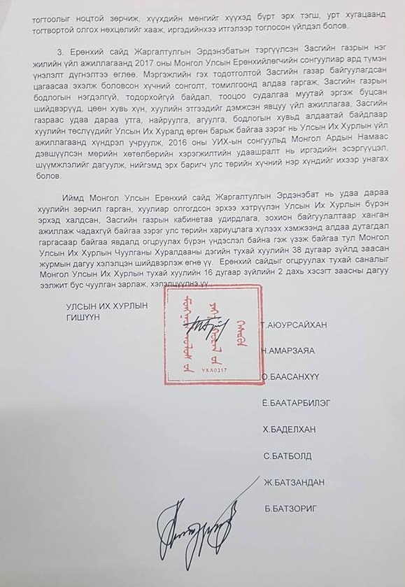 Үндсэн хууль зөрчин гацааж буй уг асуудлыг хэрэв хуулийн хугацаанд багтаан шийдэхгүй бол УИХ-ын дарга М.Энхболдод мөн хариуцлага тооцох асуудал яригдана. Ерөнхий сайдыг огцруулахгүй гэж хууль зөрчин байж хамгаалж буй үүний цаана бизнесийн бүлэглэлийн асар том эрх ашиг байгаа нь илт.