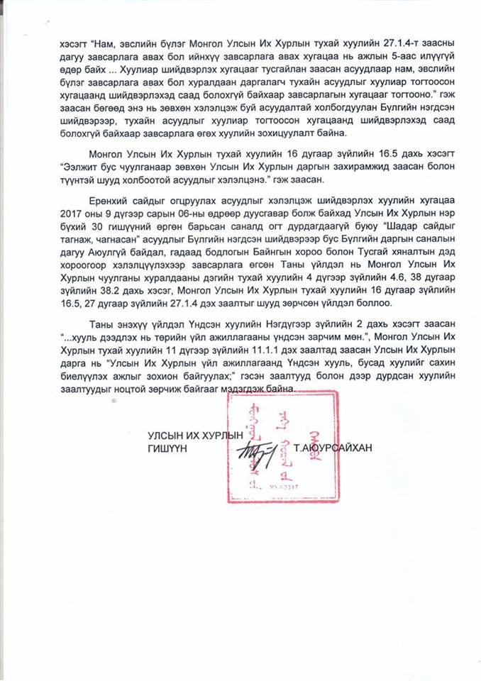 Албан тоотдоо “Ерөнхий сайдыг огцруулах асуудлыг хэлэлцэж шийдвэрлэх хуулийн хугацаа 2017 оны есдүгээр сарын 06-ны өдрөөр дуусгавар болж байхад УИХ-ын нэр бүхий 30 гишүүний өргөн барьсан саналд огт дурьдагдаагүй буюу “Шадар сайдыг тагнаж чагнасан” асуудлыг Бүлгийн нэгдсэн шийдвэрээр бус Бүлгийн саналын дагуу Аюулгүй байдлын байнгын хороо болон Тусгай хяналтын дэд хороогоор хэлэлцүүлэхээр завсарлага өгсөн Таны үйлдэл нь Монгол Улсын Их хурлын чуулганы Дэгийн тухай хуулийн 4 дүгээр зүйлийн 4.6, 38 дугаар зүйлийн 38.2 дахь хэсэг, Монгол Улсын Их хурлын тухай хуулийн 16 дугаар зүйлийн 16.5, 27 дугаар зүйлийн 27.4 дэх заалтыг шууд зөрчсөн үйлдэл боллоо” гэжээ.