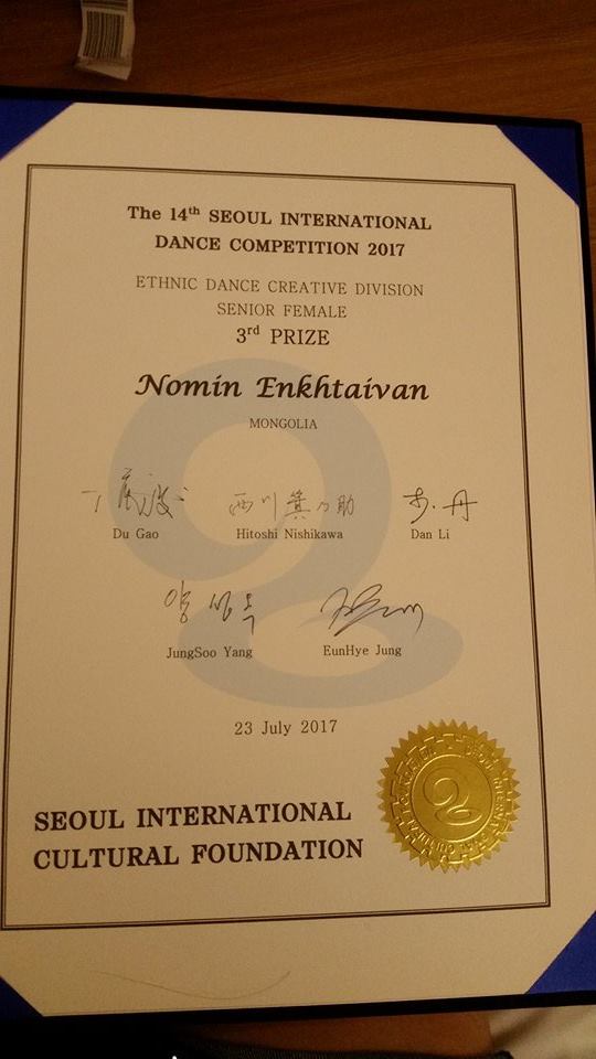- Миний сая оролцсон тэмцээн нь Солонгосын Сөүл хотноо жил бүр зохиогддог The 14th Seoul international dance competition буюу “Сөүлийн Олон Улсын гоцлол бүжигчдийн 14-р уралдаан юм. Тус тэмцээн нь оролцогчид болон шүүгчдийнхээ зэрэглэлээрээ А ангиллын тэмцээн гэгддэг. Тэмцээн нь нийт модерн, балет, этник гэсэн гурван төрлийн хүрээнд болсон. Этник нь дотроо traditional буюу язгуур, creative буюу тайзны урлаг гэсэн хоёр чиглэлээр зохион байгуулагдсан. Би creative буюу тайзны урлагийн насанд хүрэгчдийн эмэгтэйчүүдийн ангилалд оролцсон. Creative гэдэг нь язгуур урлагийн төрөл боловч ахисан төвшний тайзны урлаг гэж хэлж болно. Өөрөөр хэлбэл тавилт, дэглэлт гээд бүх зүйл нь мэргэжлийн төвшнийх гэсэн үг. Traditional төрөл нь болохоор улс орон бүрийн язгуур, үндэсний урлагийн онцлогийг харуулсан бүжиг юм. Тухайлбал, Хятадын “Ушу”, “Ши”, Монголын “бий биелгээ” гэсэн үг. Тус уралдаанд “Бүсгүй хүний заяа” бүжгээрээ гуравдугаар байранд орсон. Нийт 514 бүжигчин тус тэмцээний хоёрдугаар шатанд оролцсон ба зургаан өдрийн турш үргэлжилсэн. Төрөл тус бүр хоёр хоёр өдрийн хугацаатай болсон.