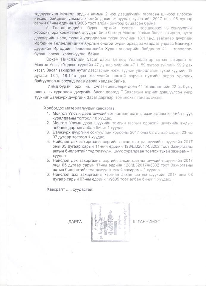 Хотын даргаас 2017 оны 9 дүгээр сарын 05-ны өдрийн 01/3049 тоот албан бичгээр дүүргийн ИТХ-д ирүүлсэн албан бичигт нэр бүхий төлөөлөгчдийг хууль зөрчсөн гэж үзсэн тухайгаа мэдэгджээ. Гэтэл Монгол Улсын дээд шүүхээс дээрх нэр бүхий төлөөлөгчид хууль зөрчөөгүй болохыг тогтоосон шүүхийн шийдвэр гараад багагүй хугацаа өнгөрчээ. Иймд хотын даргаас Монгол Улсын Үндсэн хуулийн 47 дугаар зүйлийн 47.1, 59 дүгээр зүйлийн 59.2 дах хэсэг, Засаг захиргаа нутаг дэвсгэрийн нэгж, түүний удирдлагын тухай хуулийн 18 дугаар зүйлийн 18.1, 18.1.1а дах хэсгүүдийг ноцтой зөрчин нутгийн өөрөө удирдах байгууллагын эрхэнд удаа дараа халдахгүй байхыг дүүргийн ИТХ-аас хүссэн байна.