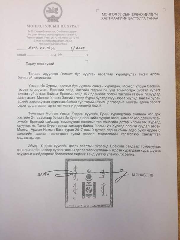Монгол Улсын Ерөнхийлөгч Х.Баттулга есдүгээр сарын 15-ны өдөр УИХ-ын дарга М.Энхболдод Ээлжит бус чуулган яаралтай хуралдуулах тухай албан бичиг илгээсэн. Тэгвэл энэхүү албан бичгийн хариуг УИХ-ын дарга М.Энхболд Ерөнхийлөгчид илгээжээ.