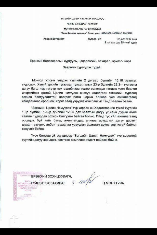 БАГШ НАР АА !!! ОДОО БОЛИВОЛ ЯАСАН ЮМ БЭ??? ЦАЛИНГ ЧИНЬ 1,6 САЯД ХҮРГЭХ ЯМАР Ч БОЛОМЖ БАЙХГҮЙГ ТА НАР МЭДЭЖ БАЙГАА ШҮҮ ДЭЭ. ЭНЭ ТЭНЭГ ШААРДЛАГА ЧИНЬ БАГШ НАРЫН НЭР ХҮНДИЙГ ГУТААЖ ГҮЙЦЭХ НЬ БАЙНА. СУРАГЧИД ХЭРЭГ ТӨВӨГТ ХОЛБОГДВОЛ ТА НАР ХАРИУЦАХ ЮМ УУ ??? СУРАГЧ НАРТ УЧИРЧ БУЙ ОЮУНЫ ХОХИРОЛ ТА НАРТ ОГТ ХАМААГҮЙ ХЭРЭГ ҮҮ ??? ТА НАРЫН ЦАЛИНГААС ИЛҮҮТЭЙГЭЭР ХҮҮХДҮҮД ХОХИРЧ БАЙНА. ТЭР ХОХИРЛЫГ ТА НАРЫН ЦАЛИН ХЭЗЭЭ Ч НӨХӨЖ ЧАДАХГҮЙ ШҮҮ БАГШ НАРАА !!! БАГШ НАР НЬ ИЙМ БОДИТ БУС, АМЬДРАЛААС ТАСАРХАЙ ШААРДЛАГЫГ ТӨРД ТАВЬЖ БАЙХАД ХҮҮХДҮҮД ЯМАР Ч ХАМААГҮЙ ШААРДЛАГЫГ БАГШ НАРТАА ТАВЬЖ БОЛОХ НЭЭ ДЭЭ...