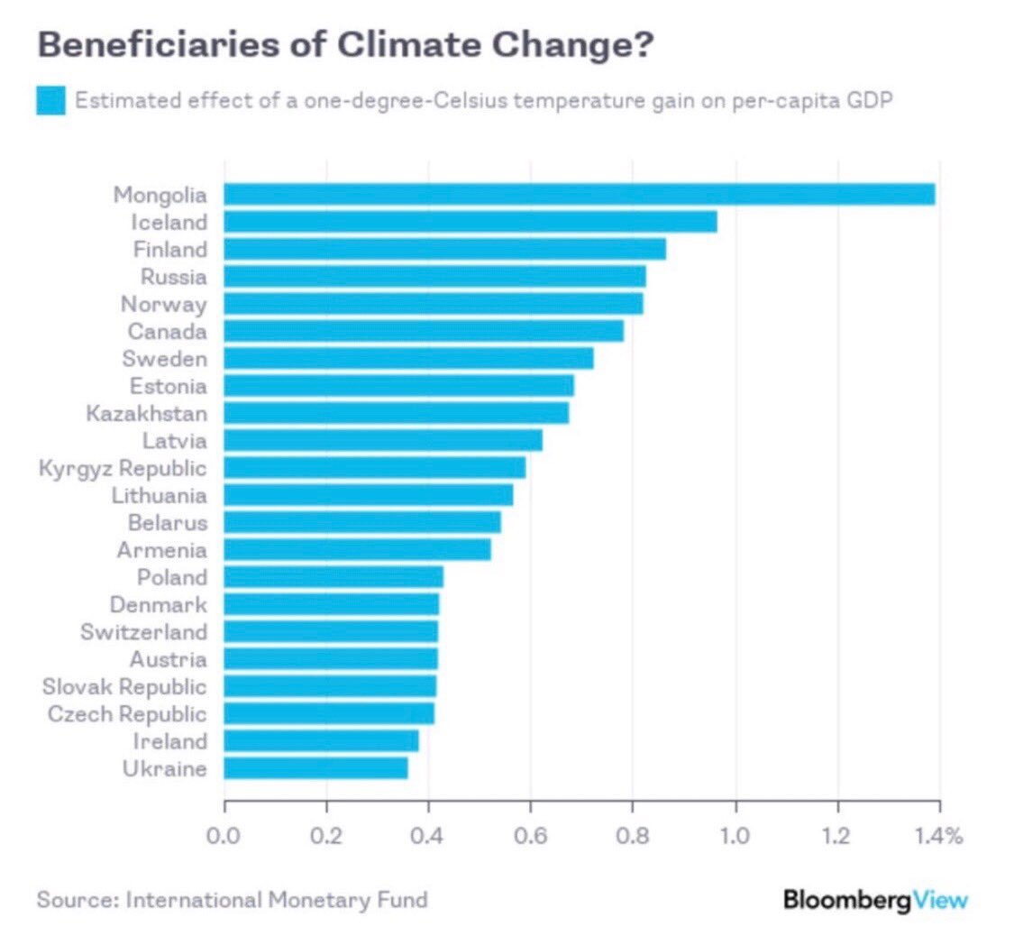 Дэлхийн дулаарал нь байгаль болон ан амьтанд асар их сөрөг нөлөөтэй байгаа билээ. Энэ талаарх судалгааг IMF тайланд тусгаж, улс орнуудад ямар өөрчлөлт үзүүлэхийг тодорхойлжээ. Бусад улс оронд цаг агаарын өөрчлөлт сөрөг нөлөөтэй байхад Монголд хамгийн эерэг нөлөөтэй байна гэсэн судалгааг хийсэн байна. Тухайлбал, Монголд нэг градус дулаарахад дотоодын нийт бүтээгдэхүүн 1,4 хувиар өснө гэж таамаглаж байгаа аж. Дулаарлаас үүдэн Монголд үл хөдлөх хөрөнгөний үнэ өснө гэсэн байна. Мөн олон улсын цаг уур орчны шинжилгээний судалгаагаар ирэх 100 жилд монгол хамгийн тааламжтай уур амьсгалтай орон болно гэжээ.