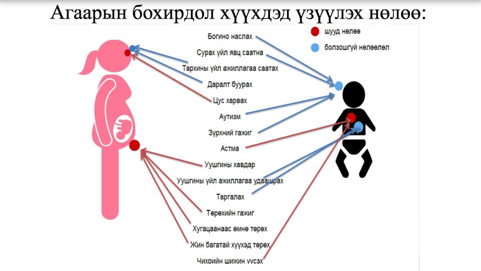 Гамшгийн хэмжээнд хүрээд буй нийслэлийн агаарын бохирдол ургийн эрүүл мэндэд хэрхэн нөлөөлдөгийг доорх зургаас харна уу.