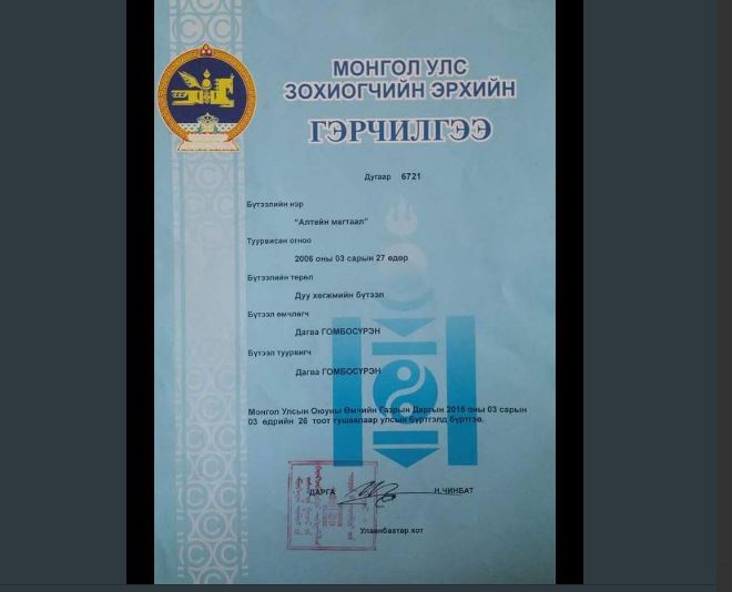 Яаж яваад, ямар үндэслэлээр Алтайн магтаал хувь хүний оюуны өмч болоод Улсын бүртгэлийн гэрчилгээ авчихсан бэ гэдгийг гарын үсэг зурсан Чинбат багш, Оюуны өмчийн газрынхан ”нэг сайхан” тайлбарлаад өгөөч... эсвэл энэ Дагвын Гомбосүрэн гэдэг нөхөр өөрөө тайлбарлаадахаач..эхлээд тайлбаруудыг нь сонсоё...