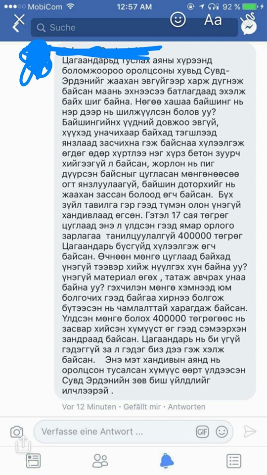 Bi ankhnaasaa l Delgeriig demjij irsen . Suvd-Erdene gedeg huuhentei hurtel ajil hiideggui hun yaj 3 n huuhedteigee amidaraad bnaa ? gej asuuj bgaad block hiilguulj deer ni Suvd -Erdenii tuslah dagan baysagchidtai ni FB -iin comment deer zunduu heleltseh bish herelddeg .bsan . Asuusan asuultiin maani orond hariult ugch chadahgui 4,5 aaraa dairaad Sarnaig buruutan bolgoh gej hachin 2 yum bichne ! Barimt chine haana bna geheer Nuguu heden arkhichidiin yriag barimt gej nadruu yvuulna kkk... bi hunii amaar bish, sarnaigiin l fact -g ni gargaad ugchih , ta nariin heleed bgaa shig ntr geheer tag!!!!