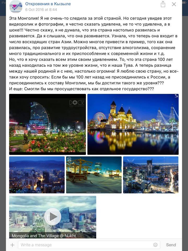 ОХУ-ны Тува улсын иргэн нэгэн бяцхан охин Фейсбүүк хуудсаараа дамжуулан Монгол улсыг тухай таатай сэтгэгдэл төрсөнөө уламжилжээ. Монголчуудын яс махны тасархай гэдгээ ухаарсан түүний сэтгэгдлээс харууслын өнгө аяс ч цухалзана. Түүний бичсэнийг Монголын иргэний хөдөлгөөнүүдийн ивэхитэн Ч.Мөнхбаярын орчуулсанаар хүргэе.