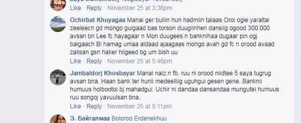 Энэхүү залилангийн хохирогч болсон нэгэн иргэн өөрийн фэйсбүүк хаягаараа мэдэгдэл хийсэн байна. Тэрбээр “Уржигдар миний фэйсбүүк хаягт танихгүй хаягнаас мессеж ирж, холбоос явуулсан байсан юм. Ирсэн холбоос руу нь орвол фэйсбүүкийнхээ нууц код, нэрээ хийж нэвтрэх хүсэлт байсан. Хэрэв тус холбоос руу нэвтэрч орбол фэйсбүүкийнхээ нууц үгээ алдана гэсэн үг. Нөхөр маань фэйсбүүк кодоо алдаад хоёр цаг орчим болоход 20 гаруй хүнээс түр мөнгө зээлээч, дансаа түр хэрэглүүлээч, 800 мянган төгрөг хэрэгтэй байна гэж нөхрийн минь хаягнаас ойр дотнын хүмүүс рүү нь бичсэн байсан. Улмаар нэг хүнээс интернет банкны кодыг нь, өөр хүнээс 600 мянган төгрөг авч амжсан байсан юм. 550 мянган төгрөг болон 700 мянган төгрөг дахин шилжүүлэх гэж байхад нь амжиж зогсоосон. Хэд хоногийн өмнө зарим найзууд фэйсбүүкээр мөнгө зээлэхгүй шүү. Өөрөө утсаар яриарай гэсэн сэрэмжлүүлэг яваад байсан нь ийм учиртай байж. Бодвол энэ цагдаа бас зургаа алдсан байх. Та нар минь болгоомжтой байгаарай” гэжээ. Энэ мэт хохирсон иргэд олон байгаа бөгөөд ихэвчлэн мөнгөтэй хүмүүсийг онилдог гэж байгаа юм.