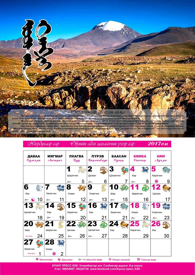 Монгол улсын төрийн тахилгат хайрхануудтай ЦАГ ТООНЫ БИЧИГ ХУДАЛДААНД гарлаа. Хэрэв хүсвэл үйлчлүүлэгч өөрийн гэр бүл болон байгууллагынхаа лого зурагтайгаар захиалах боломжтой аж. Энэхүү цаг тооны бичиг нь Арга, Билгийн тоололтой, Үс засуулах өдөр зэрэг хэрэгцээт мэдээллийг агуулсан аж.