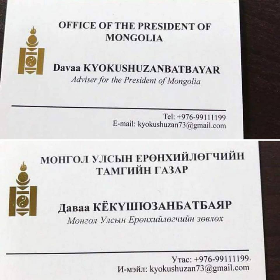 УИХ-ын гишүүн асан Кёкүшюзан Д.Батбаяр бизнесийн хөрөнгө оруулалтын асуудлаар саяхан Япон улсыг зориод ирсэн билээ. Гэтэл түүний нэрийн хуудас олныг багагүй гайхшруулаад буй. Учир нь тэрбээр нэрийн хуудасныхаа албан тушаал хэсэгт нь Монгол улсын Ерөнхийлөгчийн зөвлөх гэж тодотгосоны сацуу үг үсгийн алдаатай байсан нь хуурамч нэрийн хуудас ашигласан гэх хардлагыг төрүүлээд байсан юм.