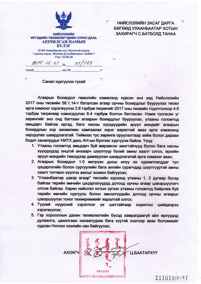 2017 оны төсвийн тодотголоор агаарын бохирдлыг бууруулахад нэмж 4,6 тэрбум төгрөг суулгасан. Ингэснээр 2017 онд нийт 8,4 тэрбумыг агаарын бохирдолд зарцуулахаар болсон юм. Үүнтэй холбоотойгоор НИТХ дахь АН-ын бүлэг Нийслэлийн хотын дарга бөгөөд Улаанбаатар хотын захирагч С.Батболдод ажлын санал хүргүүллээ. Агаарын бохирдол гамшгийн хэмжээнд хүрч байгаа энэ үед тодотголоор батлагдсан төсвийг иргэдээ агаарын бохирдлын гамшгаас хамгаалах богино хугацаанд шийдвэрлэх, яаралтай ажил зохион байгуулахыг АН-ын бүлэг санал болгосон байна.