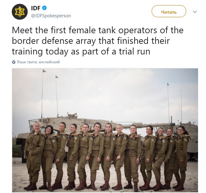 Дэлхийд анхны эмэгтэйчүүдийн танкийн экипажийг Израильд байгуулжээ. Одоогийн байдлаар 13 эмэгтэй танкистаар ажиллаж байгаа аж. Тэд дөрвөн сарын турш бэлтгэлд хамрагдаж танкистууд болсон байна. Зөвхөн эрэгтэйчүүд танк жолооддог үе өнгөрчээ.