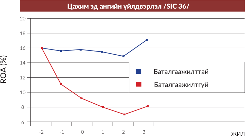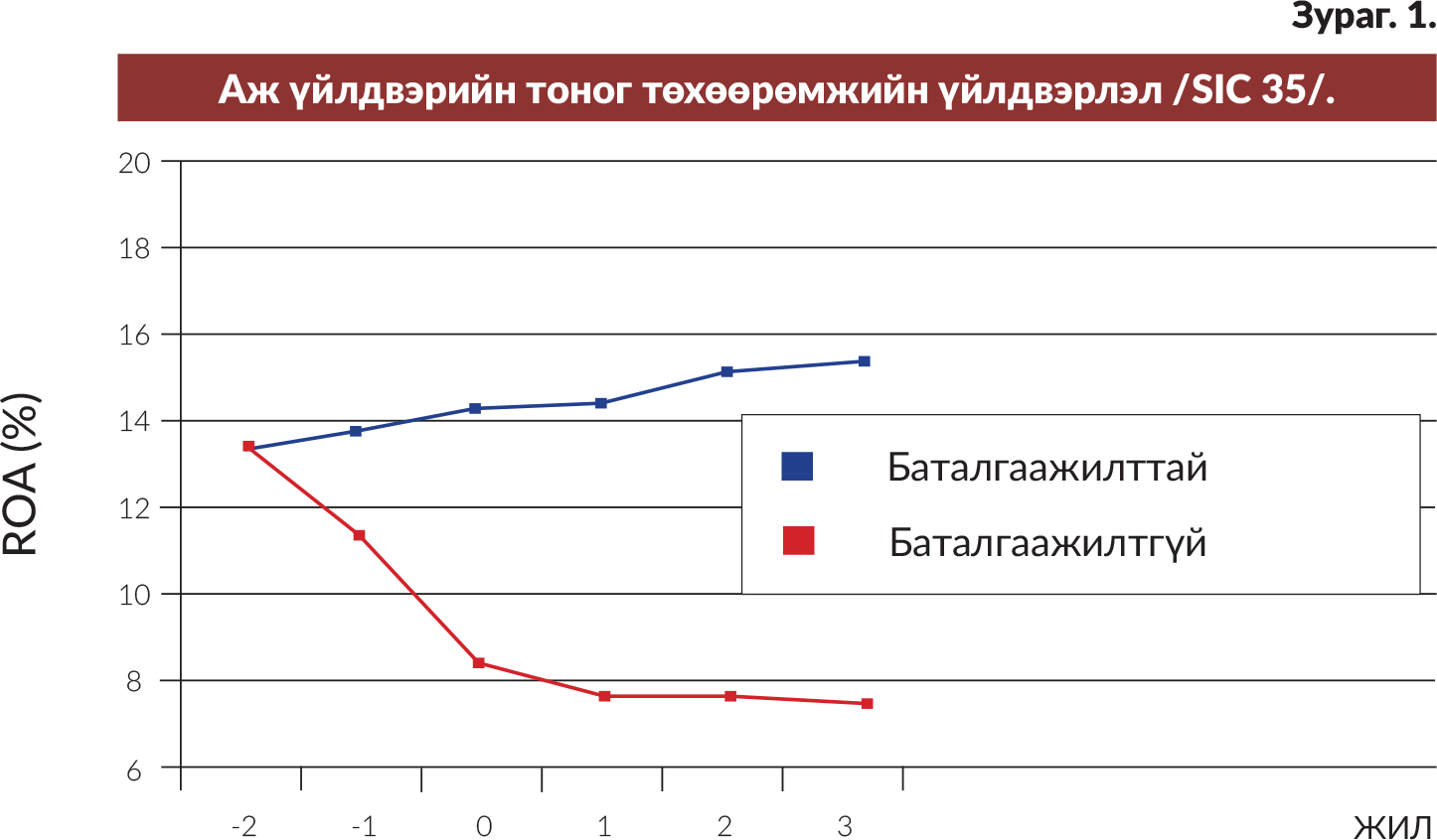 График дээр тодорхой хугацааны хөрөнгийн ашигт ажиллагааны коффициентыг /ROA-Return on Assets/ босоо тэнхлэгээр харуулав.