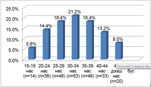 Нийт бүртгэгдсэн тохиолдлыг насны байдлаар авч үзэхэд, 39.6 хувийг 25-34 насны хүн ам эзэлж байна. 25-39 нас 58 хувийг эзэлж байна.