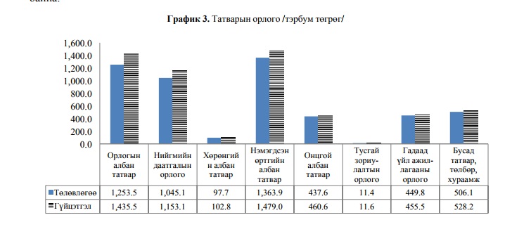 Өнгөрсөн оны мөн үетэй харьцуулахад улсын төсвийн орлого 1,290.8 тэрбум төгрөгөөр, орон нутгийн төсвийн орлого 220.9 тэрбум төгрөгөөр, нийгмийн даатгалын сангийн орлого 263.5 тэрбум төгрөгөөр тус тус өссөн байна.