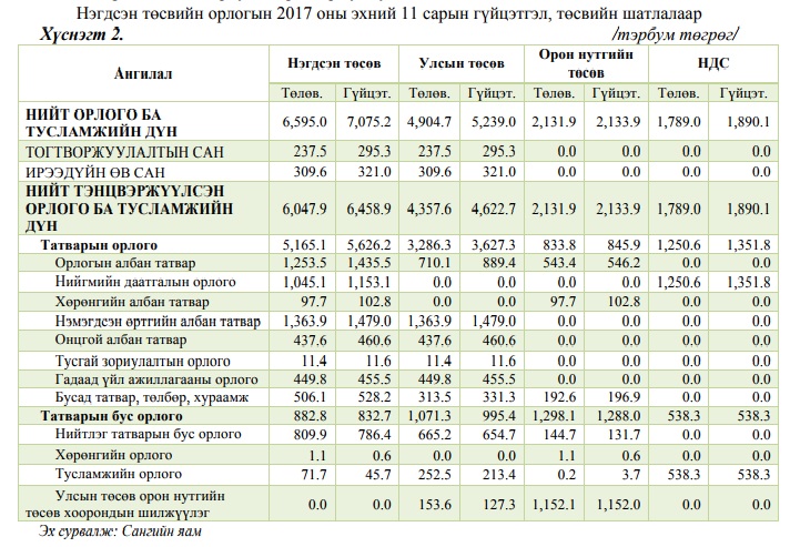 Төсвийн орлогын хувьд: 2017 оны эхний 11 сарын байдлаар нэгдсэн төсвийн нийт тэнцвэржүүлсэн орлогын гүйцэтгэл сар бүрийн төлөвлөсөн дүнгээс давж биелсэн, мөн өмнөх оны мөн үеэс өссөн зэрэг үзүүлэлттэй гарч, төсөвт эерэг нөлөөлөл бий болж байна.
