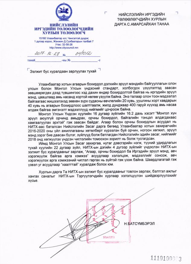 Нийслэлийн иргэдийн төлөөлөгчдийн хурлын төлөөлөгч Н.Батсүмбэрэл агаарын бохирдол, утааны асуудлаар НИТХ-ын ээлжит бус хуралдааныг яаралтай хуралдуулахыг шаардлаа. Энэхүү шаардлагаа өнгөрсөн сарын 28-нд НИТХ-ын дарга С.Амарсайханд хүргүүлжээ.