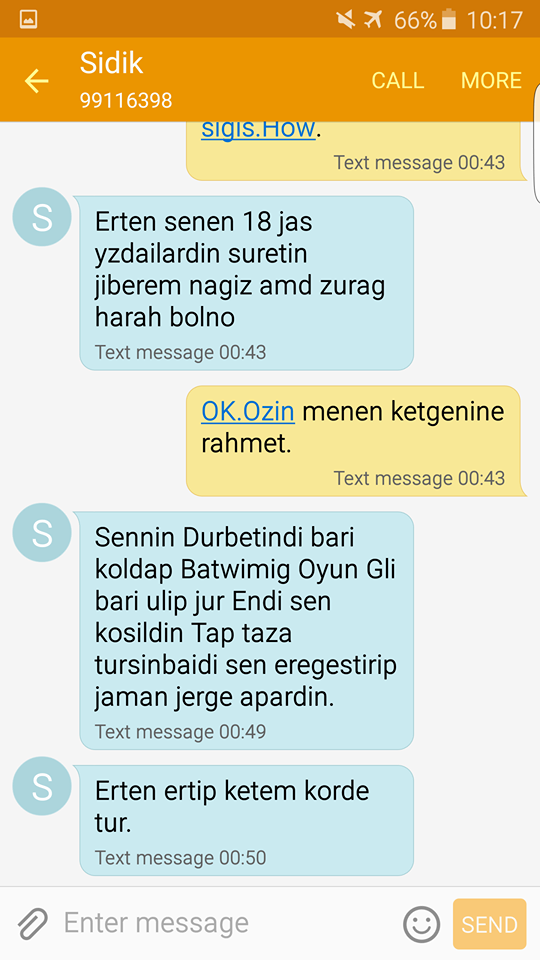 - Хэрэв надад ямар нэгэн зүйл тохиолдвол Мурат гишүүнтэй холбоотой байх болно. Энэ тухай гэр бүлийнхэндээ ч гэсэн хэлж байгаа. Надад одоо дэлгэж байгаагаас ч илүү ноцтой олон мэдээлэл байгаа гэдгийг хэлье. Мурат миний эсрэг мэдээлэл гаргана гэсэн. Тэр үед нь би илүү их ноцтой мэдээллүүдийг дэлгэх болно. Над руу бичсэн ёс бус мессеж нь Казак хэл дээр болохоор хүмүүс ойлгохгүй байх. Тиймээс би бүх бичсэн мессежийг нь монгол хэлнээ буулгаж олон нийтэд цацна. Зарим нэг мессэжийг энд дэлгэе. Дараах мессеж дээр Мурат “Монголын 16, 18 настай охид хогон дээр хэвтэж байдаг. Хэрэв тэдэнд мөнгө өгвөл юуг ч хийж өгнө. Чи хөгшин хүүхэн. Гэхдээ би чамайг, хүндэлж, хайрлаж, хүсэж байна” гэх утгатай зүйлс бичигдсэн байгаа.
